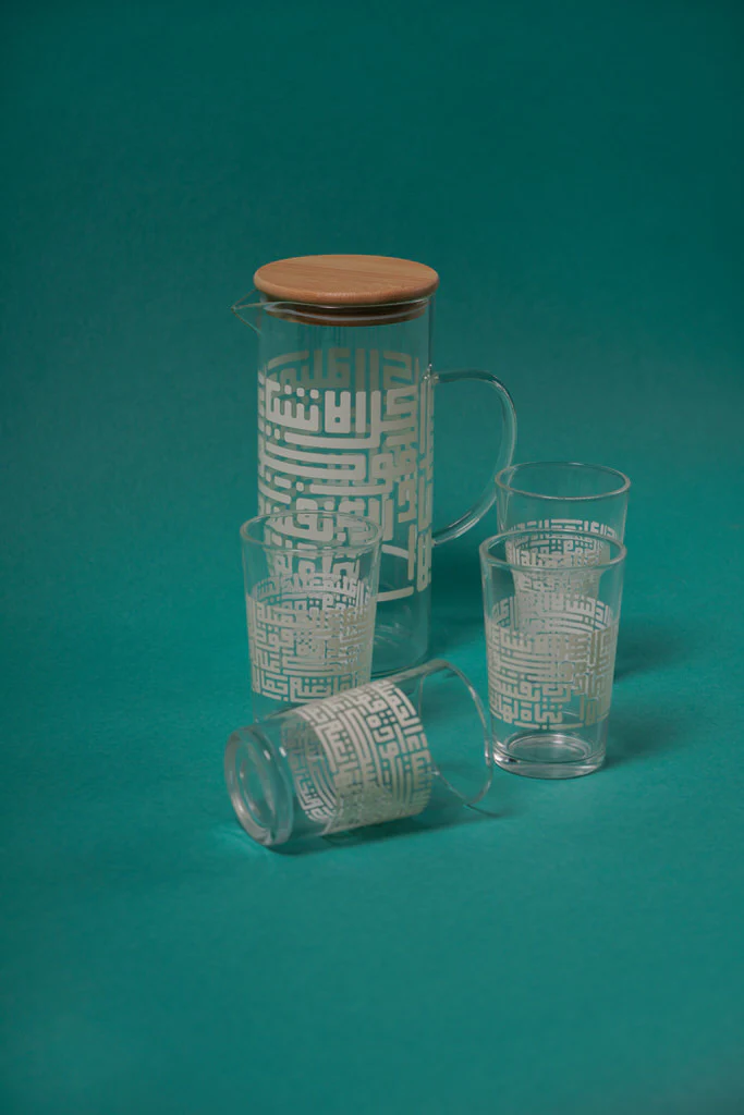 طقم إبريق زجاجي به 4 أكواب زجاجية بنقش حروف كوفية