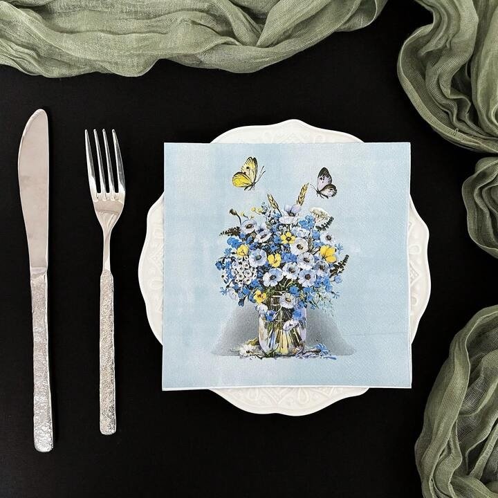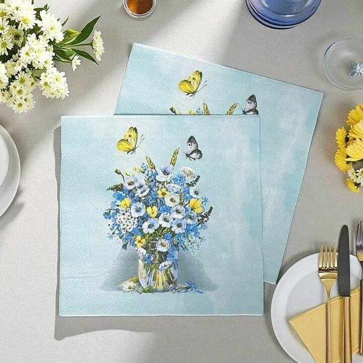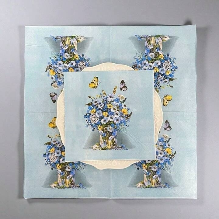 مناديل مطبوعة بالازهار والفرشات الزرقاء